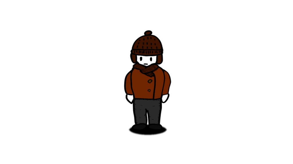 最後にシンサクは、タンスから茶色いマフラーを取り出して首に巻く。